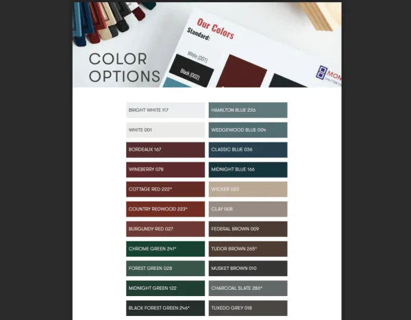 | Color | BLACK 002, BLACK FOREST GREEN 246, BORDEAUX 167, BRIGHT WHITE 117, BURGUNDY RED 027, CHARCOAL SLATE 286, CHROME GREEN 241, CLASSIC BLUE 036, CLAY 008, COTTAGE RED 222, COUNTRY REDWOOD 223, FEDERAL BROWN 009, FOREST GREEN 028, HAMILTON BLUE 236, MIDNIGHT BLUE 166, MIDNIGHT GREEN 122, MUSKET BROWN 010, TUDOR BROWN 265, TUXEDO GREY 018, WEDGEWOOD BLUE 004, WHITE 001, WICKER 023, WINEBERRY 078 |